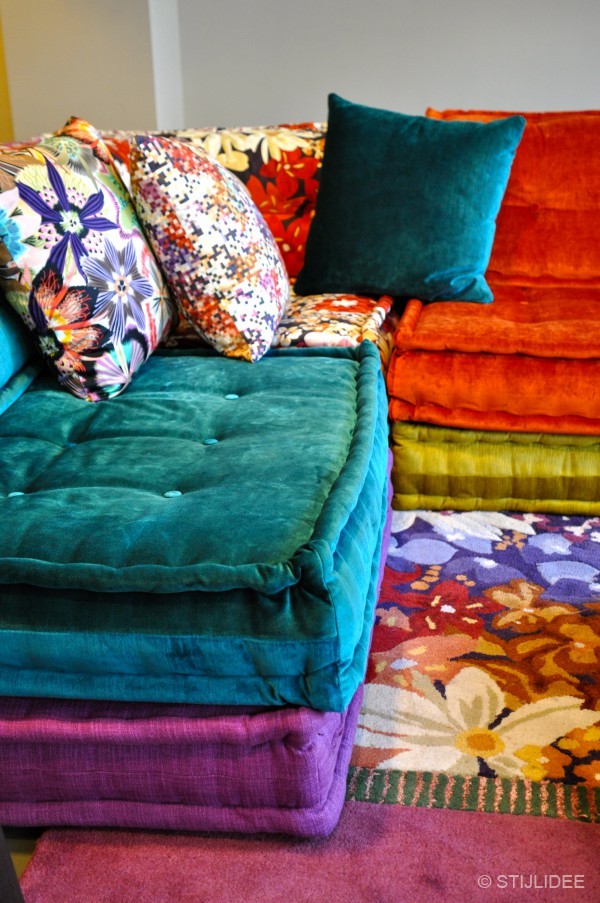 Quest'immagine l'ho scelta perché, nonostante il divano sia fantastico, l'unione di colori molto intensi a fantasie diverse è davvero troppo. La foto è molto bella ma penso che un'arredamento così colorato stancherebbe dopo poco tempo. Se invece abbinassimo dei cuscini ed un tappeto dalle tonalità chiare il divano, anche in questo caso, acquisterebbe "valore" ed importanza.