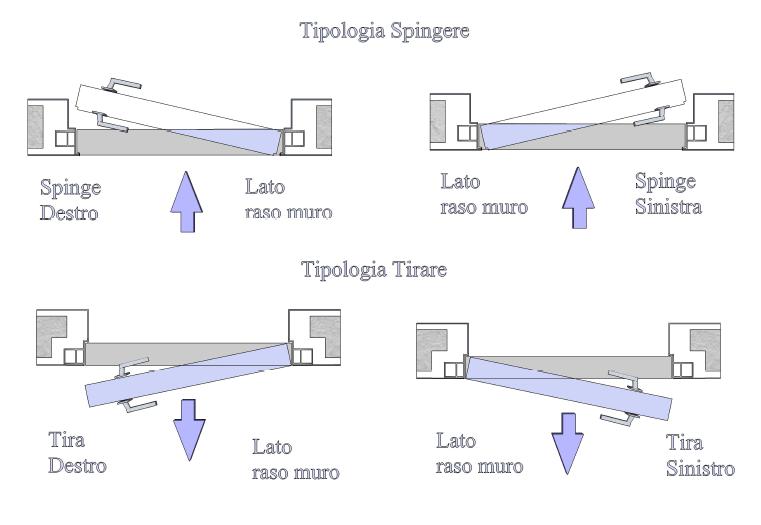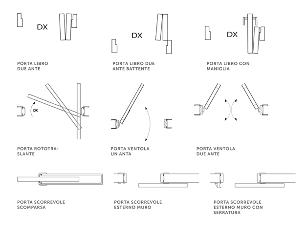 Questo è uno schema di alcune delle tante tipologie esistenti. Le classiche porte a battente, quelle scorrevoli, a libro, ad anta singola o accoppiata, rototraslanti, a filo muro ecc. ...