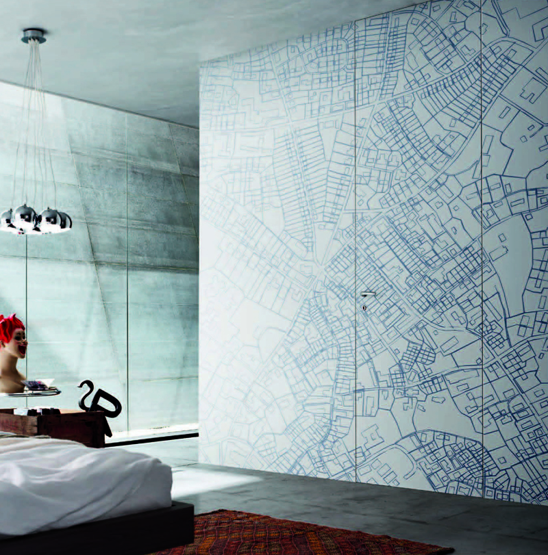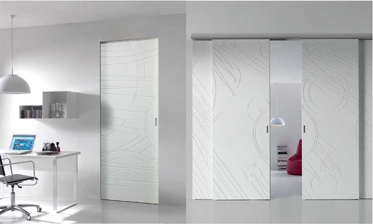 - nascondere la porta nella parete utilizzando tipologie a filo muro e decorandole con gli stessi colori o decorazioni della parete